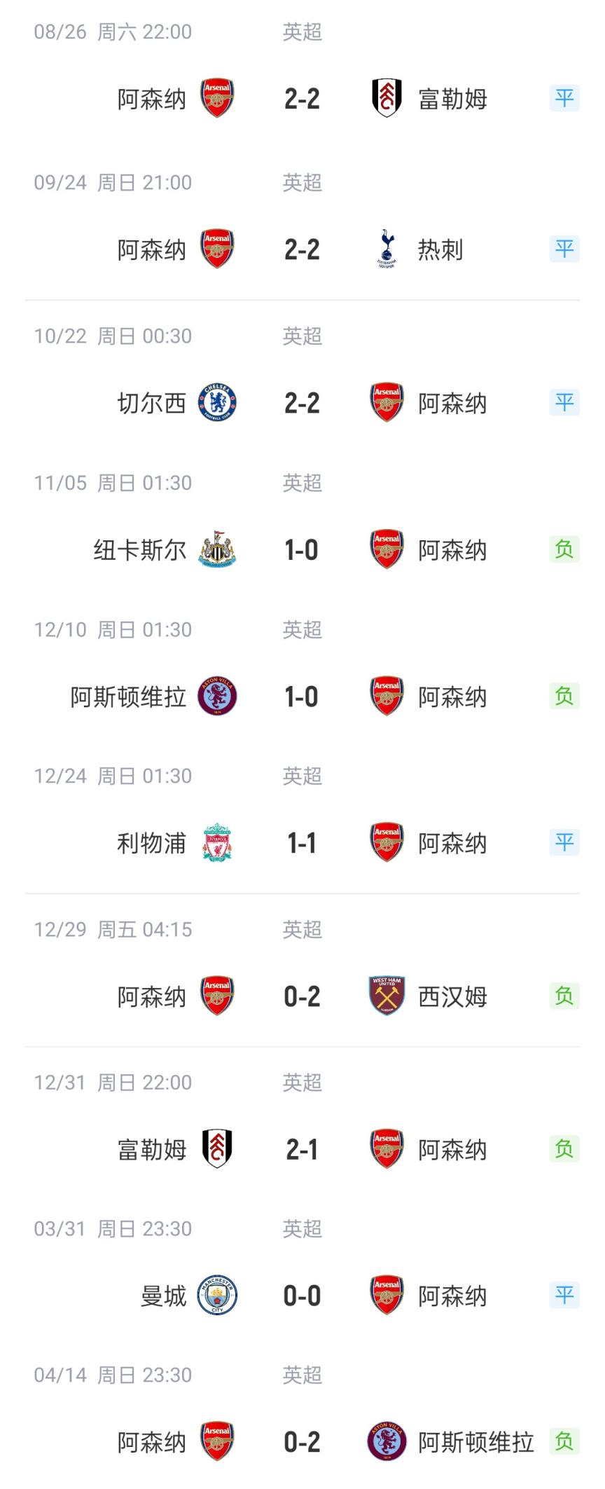 哪场最不该?阿森纳丢分比赛一览:对富勒姆仅拿1分,遭维拉双杀